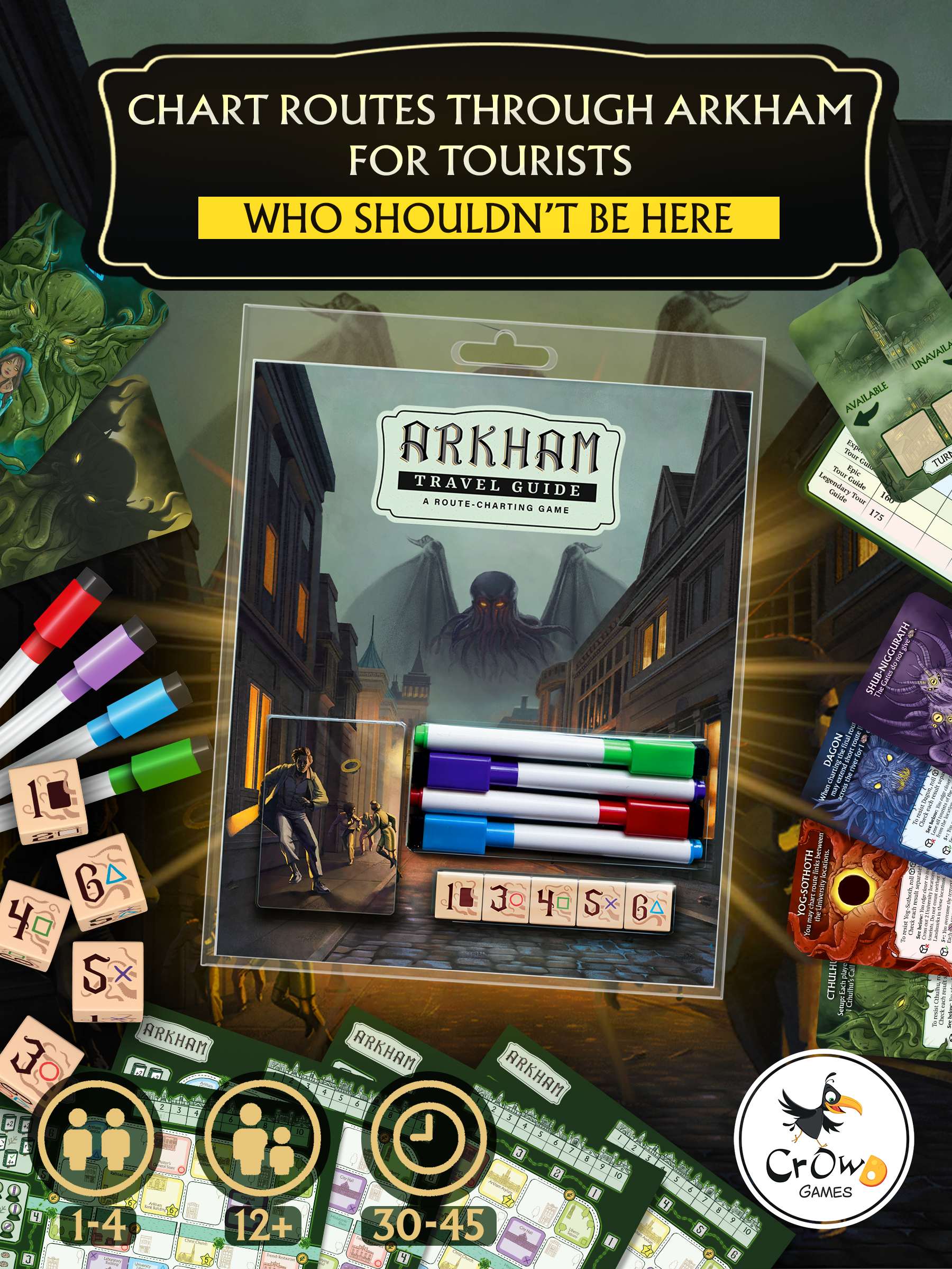 Arkham Travel Guide is a clever roll-and-write game where players chart eerie tour routes through a haunted New England city teeming with Curio Shops, mysterious Gates, and Horrible Places. Use your knowledge of the city to safely escort your tourists past arcane threats—and do you best to dodge the Old Ones themselves.