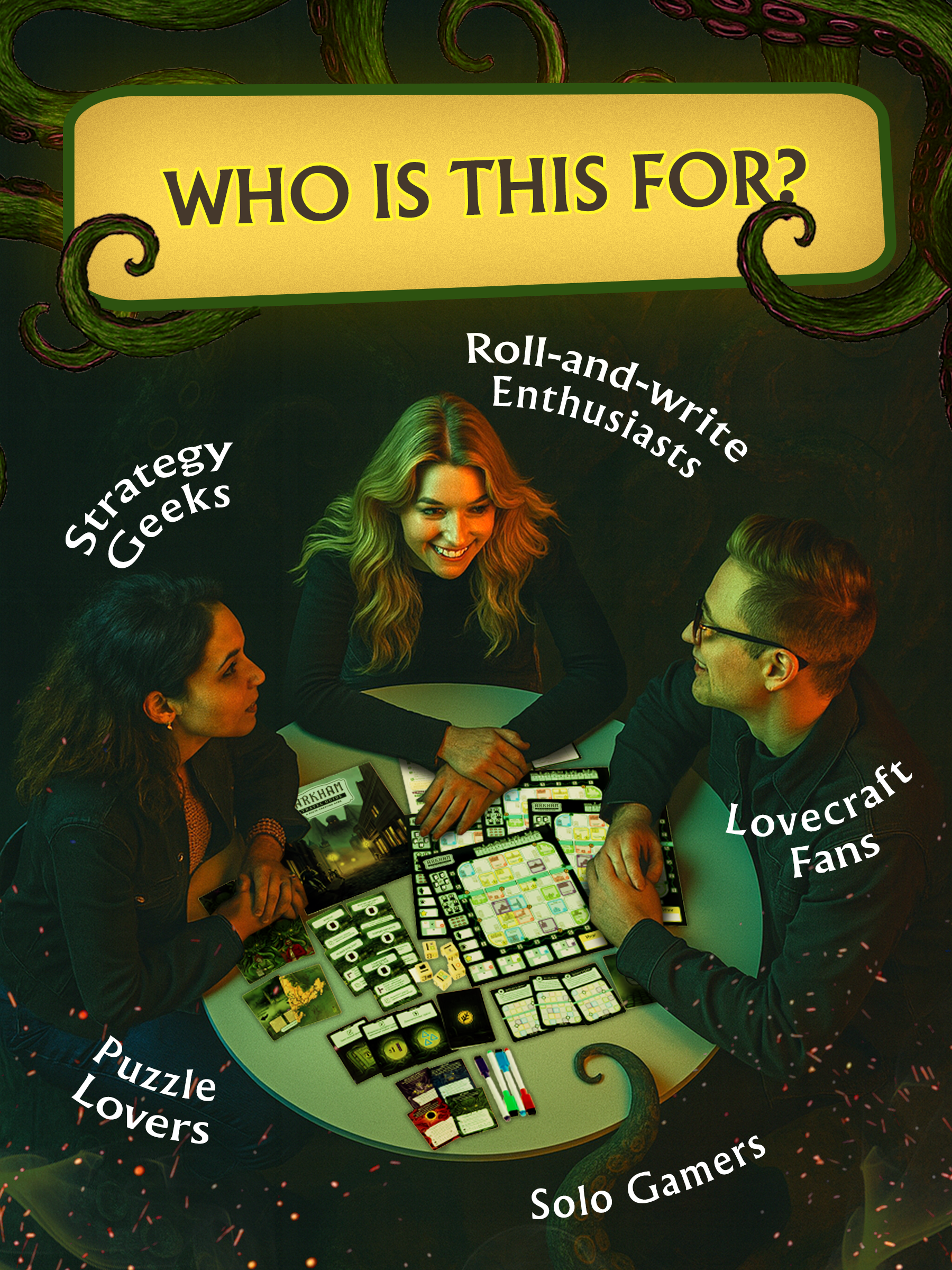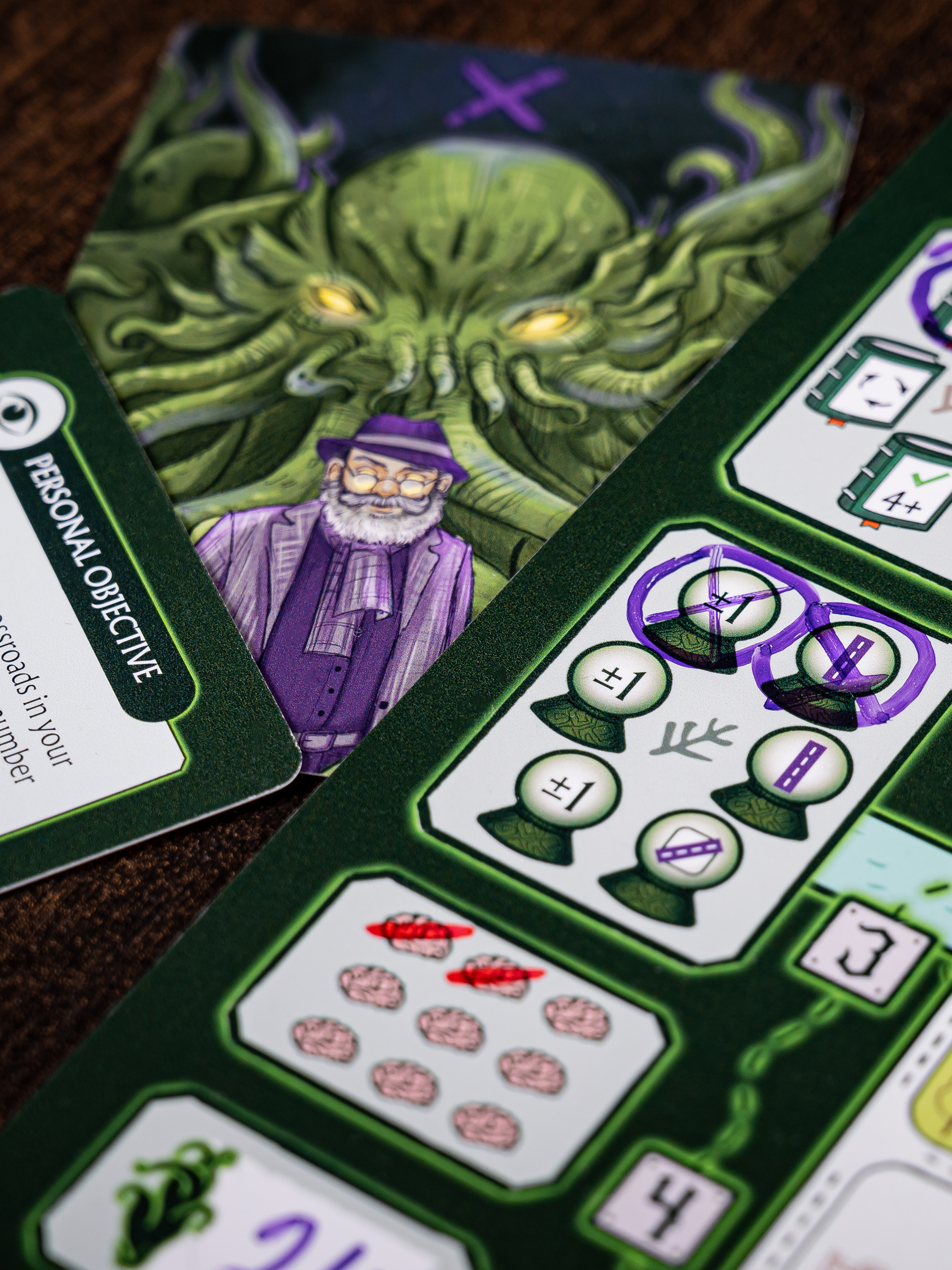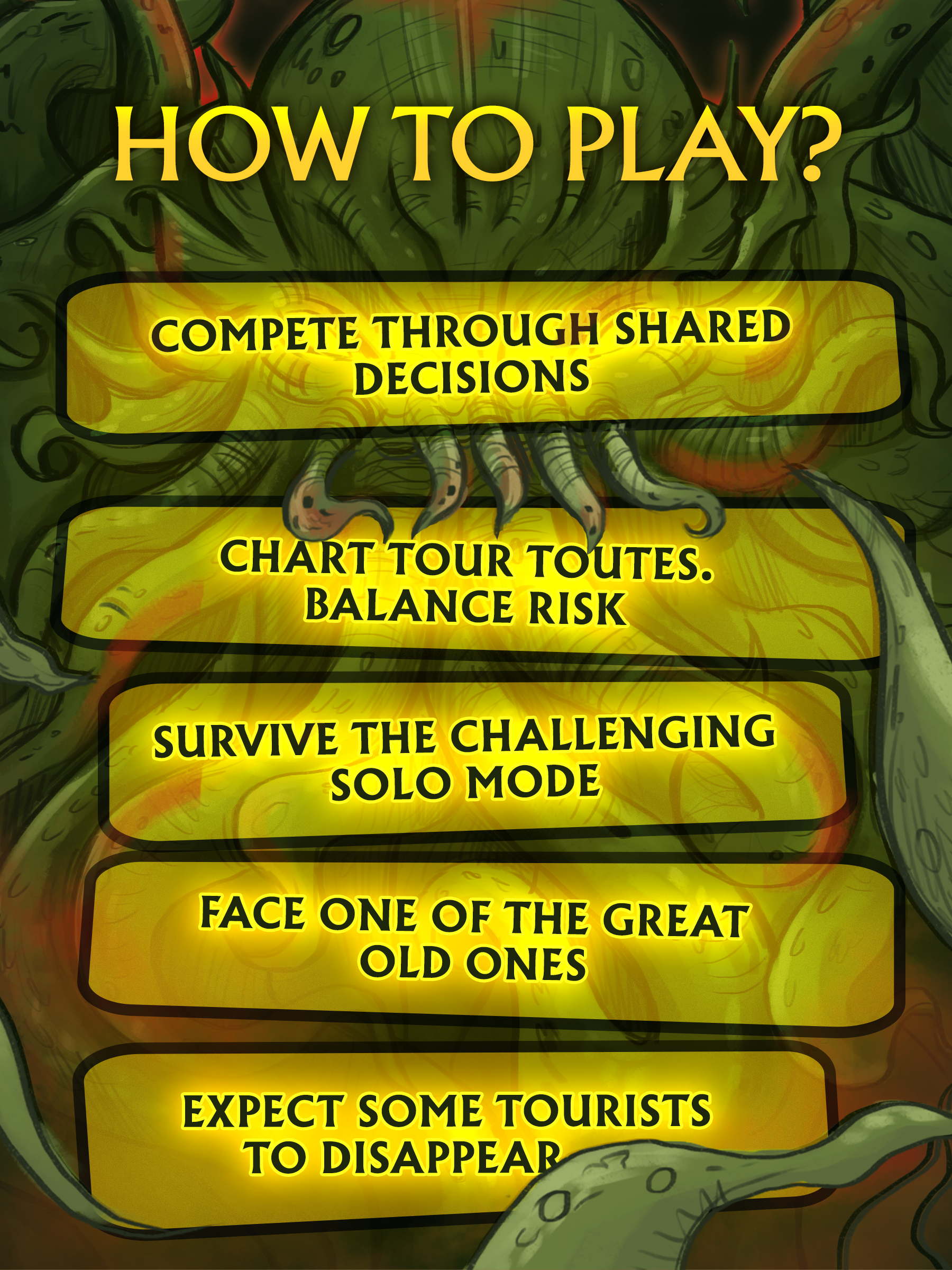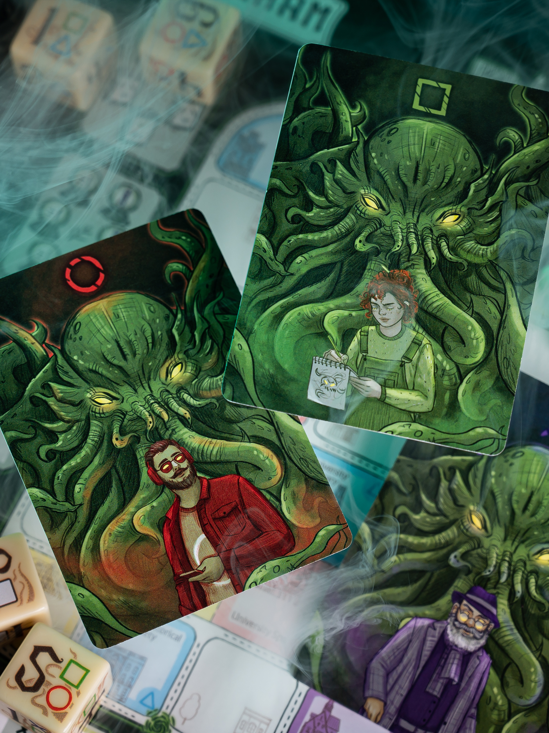 • Face legendary Old Ones (Cthulhu, Yog-Sothoth, Dagon, or Shub-Niggurath) at game’s end—gain rewards or risk losing everything