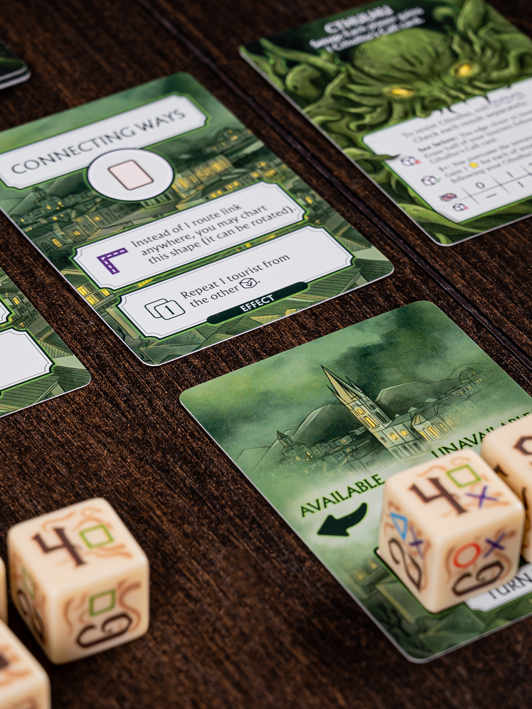 Score points by connecting tourists and landmarks, fulfilling personal objectives, and surviving your cosmic encounter. The player with the most victory points becomes the ultimate Arkham guide!