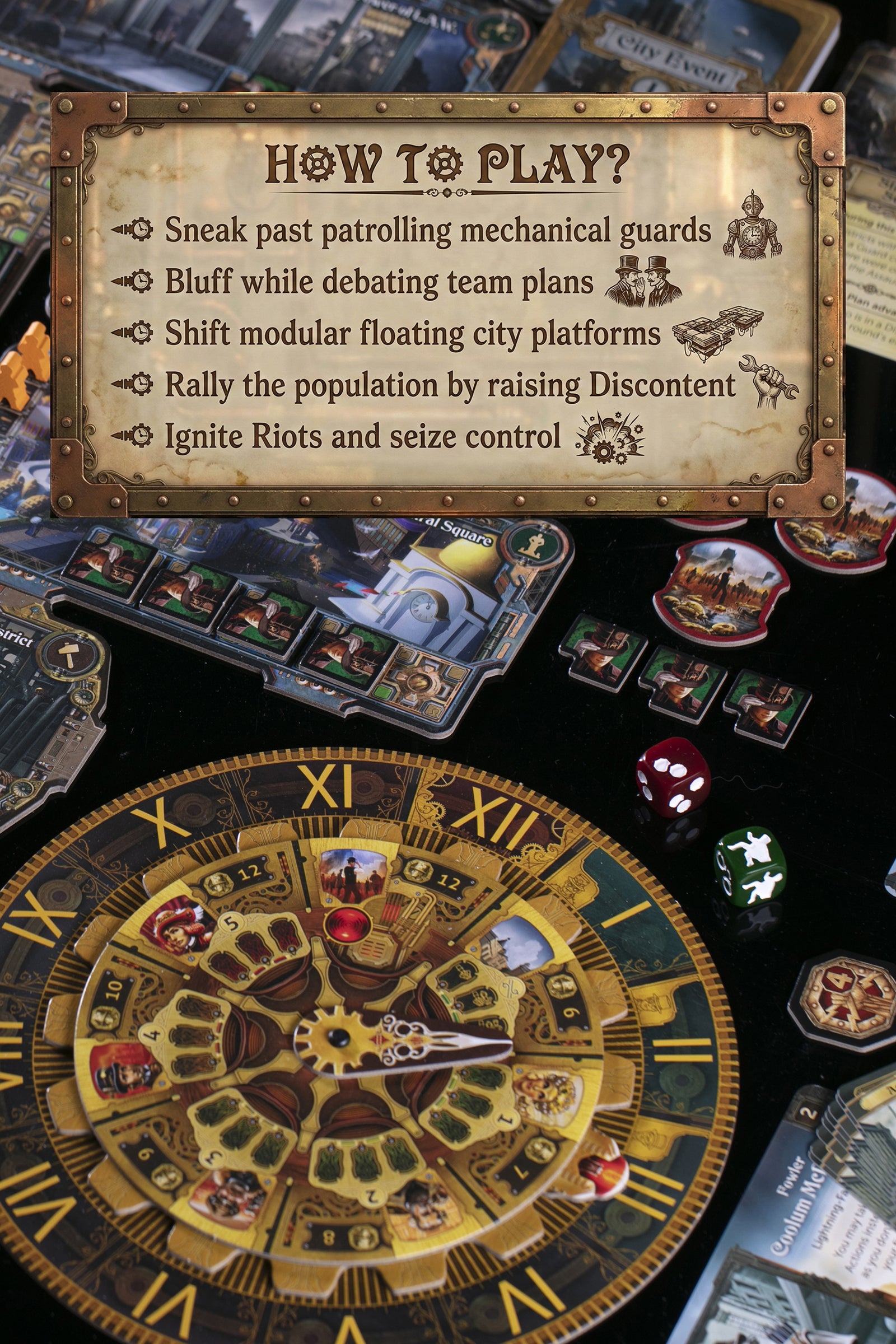 Modular city map. A stunning modular steampunk city map that changes every game — every playthrough feels fresh.