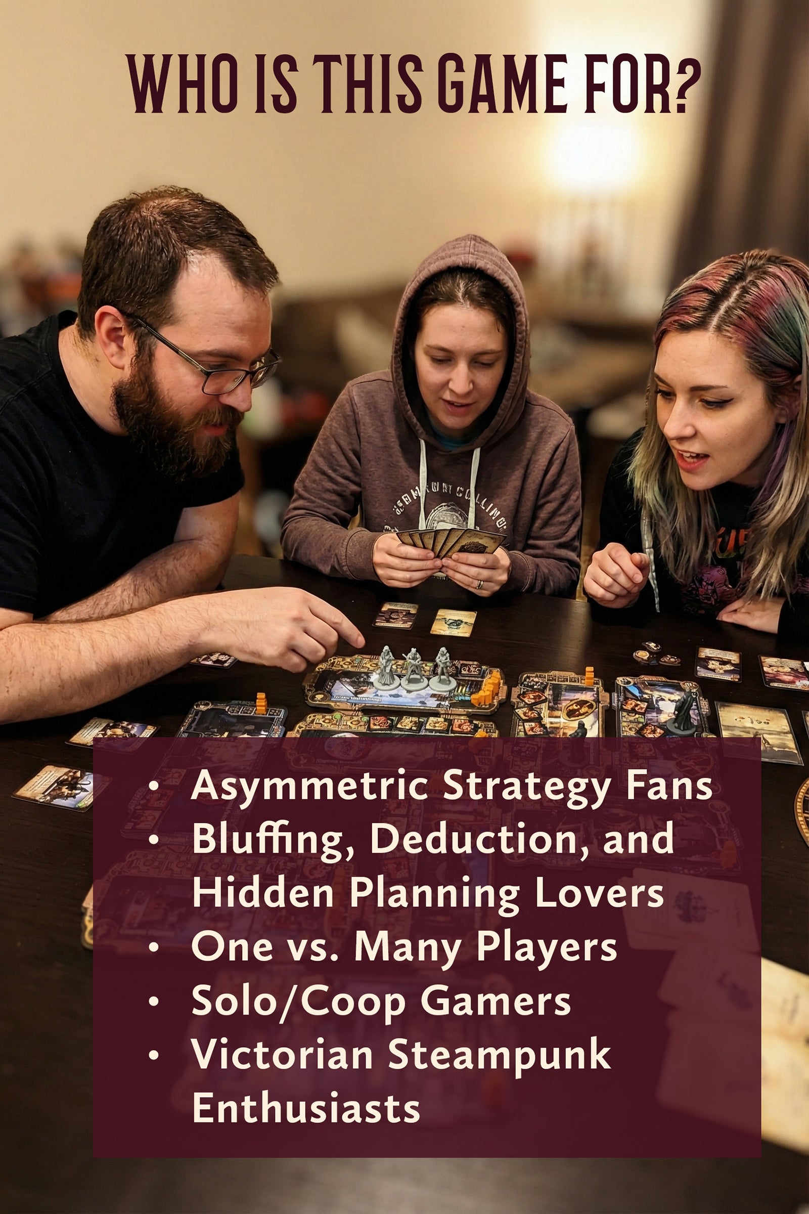 • Groups that love thematic depth, tension, and storytelling — 1, 2, 3 or 4 players.